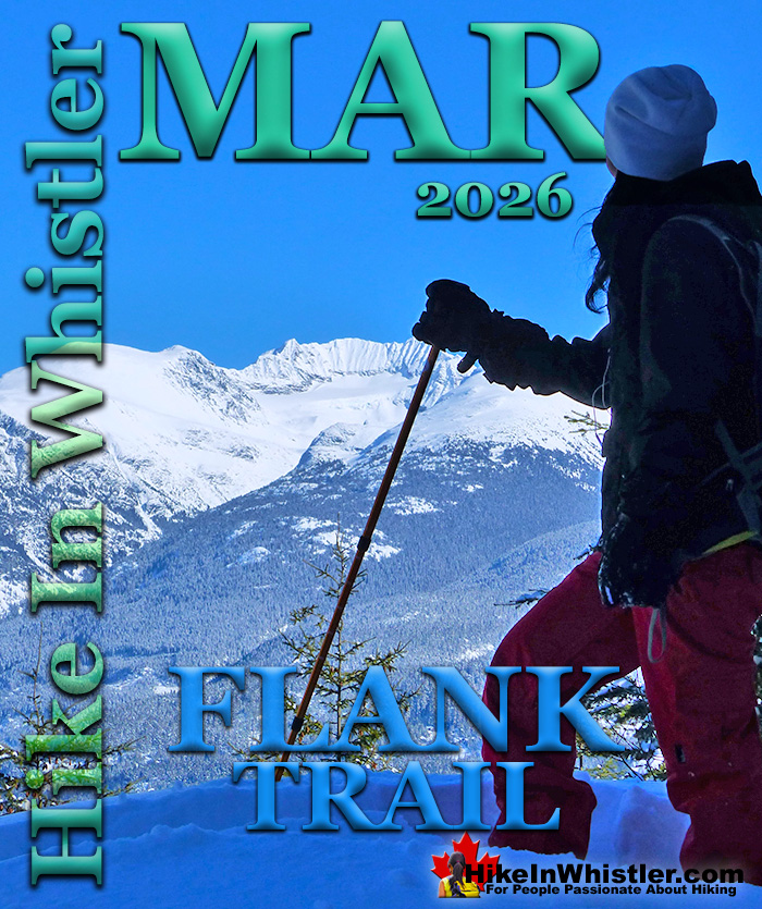 After Rainbow Falls, you can backtrack a few dozen metres and then head off to the right and uphill towards the Rainbow Lake trail. In just a couple minutes you will see the water treatment building and a nice map board. If you take the wide path/service road on the immediate right of the building you will see, (in just a couple dozen metres) the cute, snow covered bridge over the river. This is a beautiful little area, and in the winter, very deep in snow. You can continue past this bridge, however, the bridge marks the end of the best sights to see. Back on the main, Rainbow Trail, you will notice signs for the Flank Trail. In this section, the Rainbow Trail and the Flank Trail overlap for about 400 hundred metres. If you follow this overlapping trail as it bends around the water treatment building, quickly ascending in the direction of Rainbow Lake, you will come to the Flank Trail junction. The Flank Trail quickly ascends through deep forest and after about 15 minutes opens up and begins to gradually flatten out. The views become beautiful and trail less tiring. Whistler Mountain, Blackcomb Mountain and Wedge Mountain all come dramatically into view and Alta Lake appears far below. Just steps from the trail take you to pristine, snowy outcrops, perfect for taking in the view on a sunny day.. and with most of the Flank Trail south facing, sun will always be facing you over Whistler Mountain.
